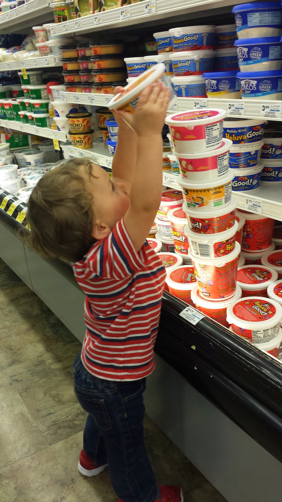 So we left Chris to do the shopping and took laps, exploring all of the options. Riley was particularly fascinated by the ricotta cheese and sour cream display and took it upon himself to reorganize. They clearly looked much better out of color order and in a tall stack! This picture was taken just before the last one was placed on top, just slightly off balance, and I had to catch the Leaning Tower of Ricotta Cheese-a!
